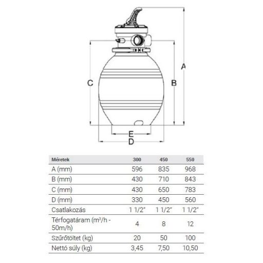 Termék leírása: Ezt a homokszűrő tartályt arra tervezték, hogy homok használatával tisztán és hulladékmentesen tartsa medencéjét. Ez egy nagyon gazdaságos és alacsony karbantartást igénylő módja annak, hogy medencéje vizét mindíg tiszta legyen. A homokszűrő tartós, nagy sűrűségű polietilénből készült. 4 m³/óra áramlási sebességgel működik. A művelet megkezdéséhez 20 kg szűrőhomokra (a csomag nem tartalmazza) van szüksége. A szűrő egy többkimenetes, 4-állású szeleppel van felszerelve. Főbb jellemzői: -Minden típusú kisméretű medencéhez ajánlott. -A bilincses rögzítésű 4-utas TOP váltószelep 360°-ban forgatható, így megkönnyíti a telepítést. -A felső diffúzor biztosítja a víz egyenletes eloszlatását a homokrétegben. -A tartály fröccsöntött HDPE polimetrikus anyagból készül. -Nagy méretű leeresztő a könnyebb szervizelés és téliesítés érdekében. Műszaki adatai: -Anyaga: HDPE -Térfogatáram: 4 m³/h -Csatlakozás: 1 1/2" -Tartály átmérő: 300 mm -Szükséges szűrőhomok: 20 kg -Magassága: 596 mm -Szélessége: 330 mm -Súlya (nettó): 3.45 Kg