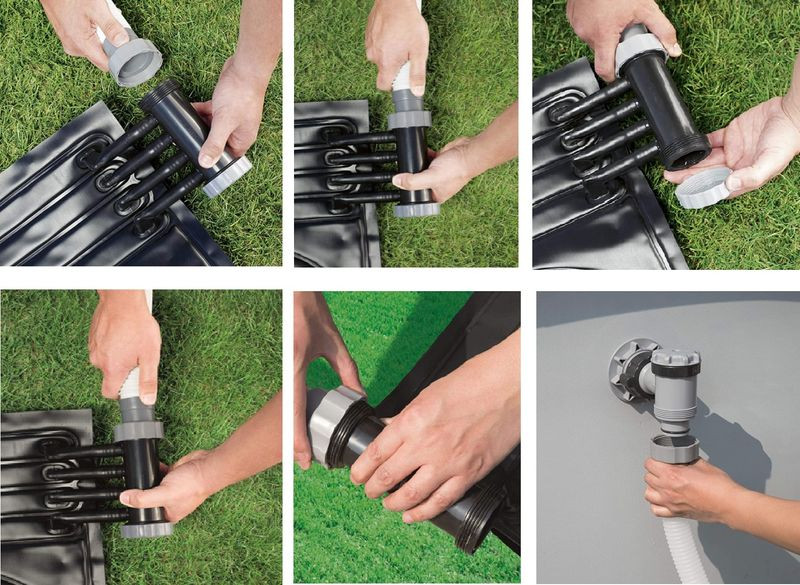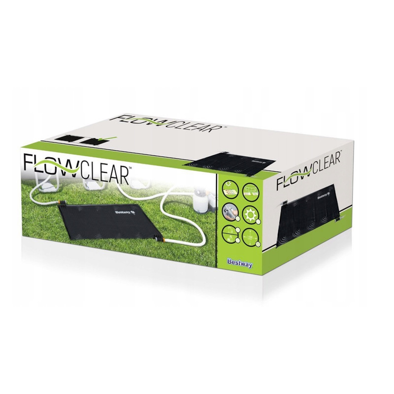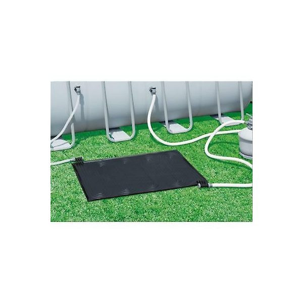 Bestway szolár szőnyeg föld feletti medencékhez. Környezetbarát napenergiás technológia növeli a hőmérsékletet a medence vízben mintegy 3-5 fokkal, függően az időjárási viszonyoktól legfeljebb 9,4m3/h-s papírszűrős vagy legfeljebb 7,6 m3/h-s homokszűrős vízforgatóhoz ajánlott mérete: 1,1m x 1,71m. Könnyen beüzemelhető, tartalmazza a 32 és 38 mm-es átalakítót és a 0,5m-es gégecsővet a bypass csatlakozáshoz 0,9 mm vastag PVC anyag. Fűtési felület: 1,46 m2, több is összeköthető nagyobb medencékhez. Méretezés: 0-4000 liter között 1 db, 4000-7000 liter között 2 db, 7000-11000 liter között 3 db, 11000-14000 liter között 4 db, 14000-21000 liter között 5 db szolár szőnyegre van szükség