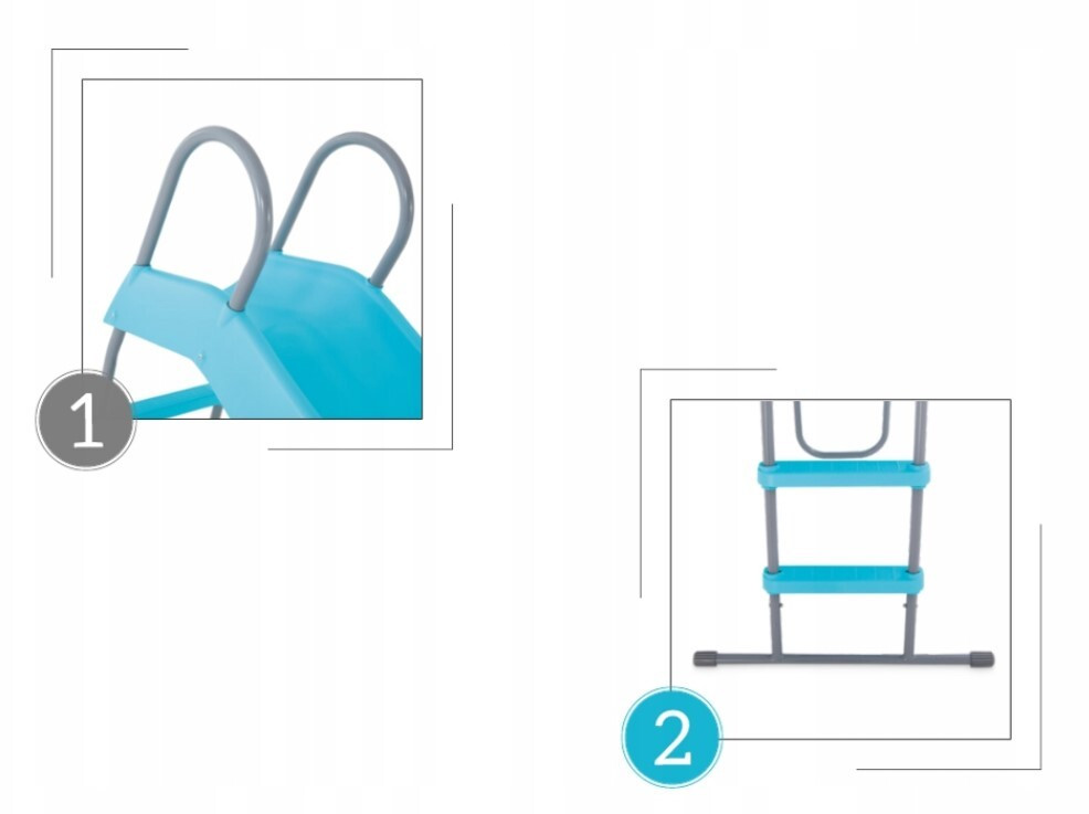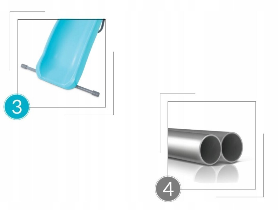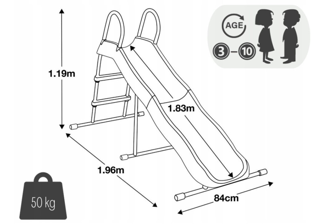 Jellemzők: Méret: (összeszerelve): 196 x 84 x 119 cm A csúszórész hosszúsága: 183 cm Maximális terherbírás: 50 kg Erős acélváz Műanyag lépcsők Horganyzott és porszórt acélcsövek Acélcsövek átmérője: 28 mm Az Intex a minőségre és a biztonságra helyezi a hangsúlyt. A csúszda porszórt horganyzott acél csövekből, kétrészes, fröccsöntött műanyag konstrukcióból - az anyag tartósságának szem előtt tartásával készült. A termék használata 3 - 10 éves kor között ajánlott.