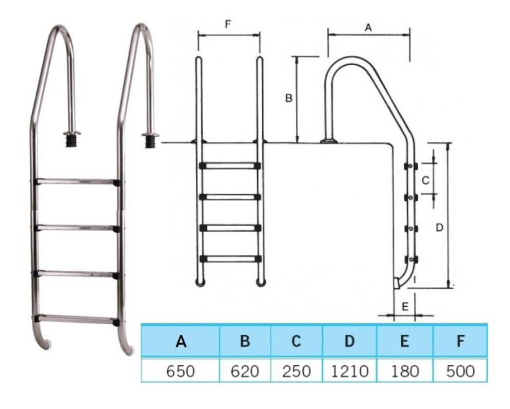 A létra rozsdamentes nemesacélból készült, melynek átmérője 4,3 cm. Gumitappancsai védik a fóliát az acélléra peremétől A termék felső része 61 cm-re áll ki a talajon lévő rögzítési ponttól, mely változhat, amennyiben lefúrható létratalpat használ. A 61cm-es magasság a fémrészek vágásával csökkenthető! A két ív közötti távolság 50 cm
